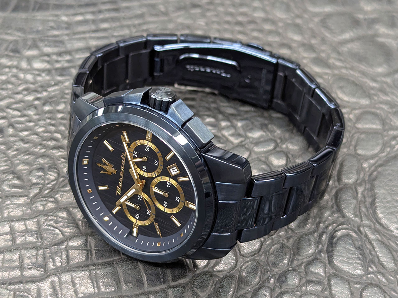 Maserati のブレスレットモデルをご購入の方に「コマ外しツール」プレゼント! Ref.: R8853151010 ムーブメント: 日本製クォーツ(TMI VD33) ケース: 316Lステンレススティール / サイズ:直径43mm 厚さ10.5mm / SILVER ケースバック: 316Lステンレススティール / SILVER 風防: ミネラルガラス 文字盤: クロノグラフ / ルミノバインデックス / BLACK バンド: 316Lステンレススティール / バンド幅:22~20mm / クラスプ:三つ折れダブルロック / SILVER 機能: 時・分・秒、デイト、デュアルタイム 防水: 5ATM(日常強化防水) 付属品: 純正BOX、保証書 保証期間: 2年