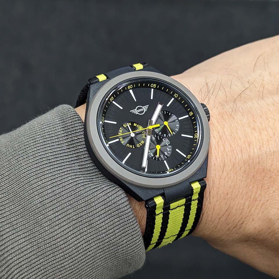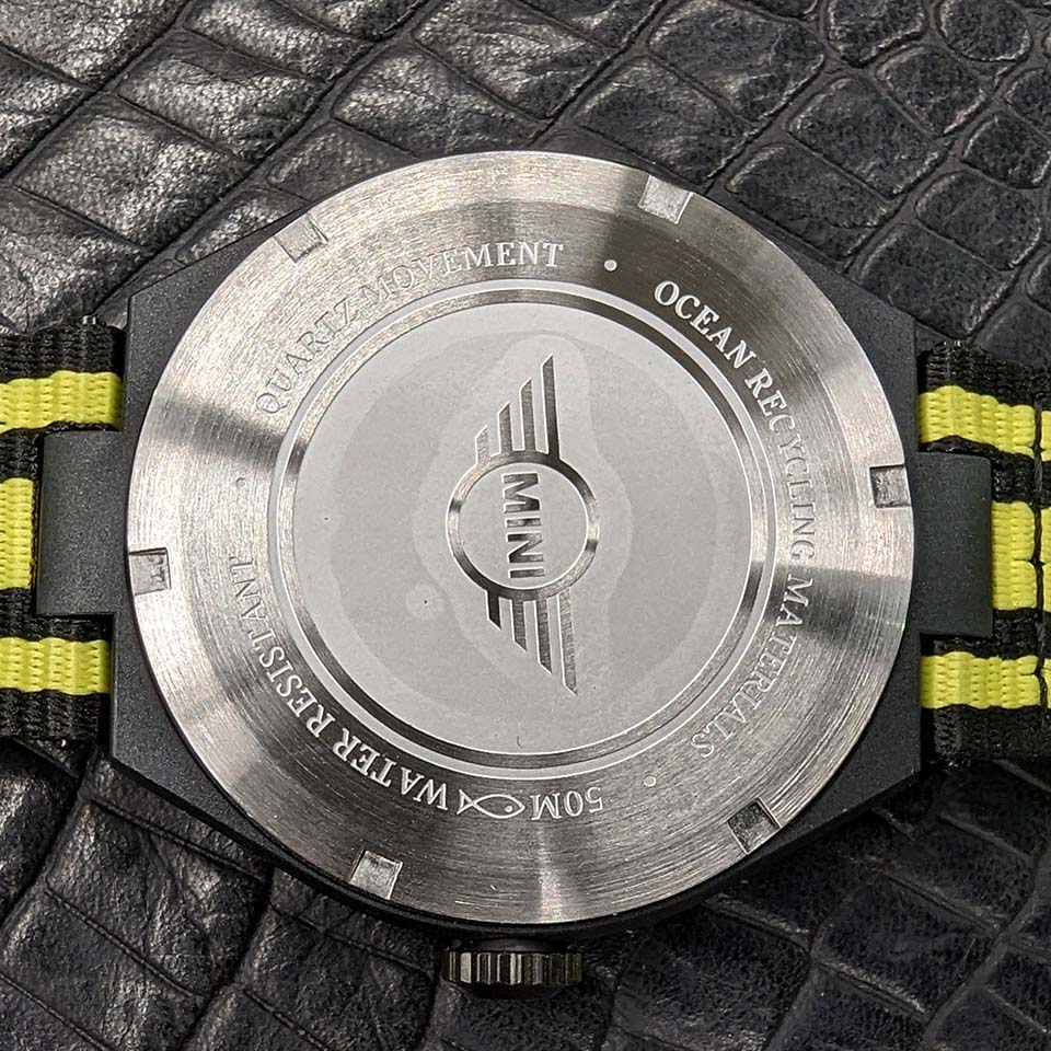 先進的な自動車ブランド MINI のサステナビリティを腕時計で表現したモデルです。海に廃棄された漁網やペットボトルなどのプラスチックゴミを元にアップサイクルした素材を「ケース」「ベゼル」「ストラップ」に使用しています。