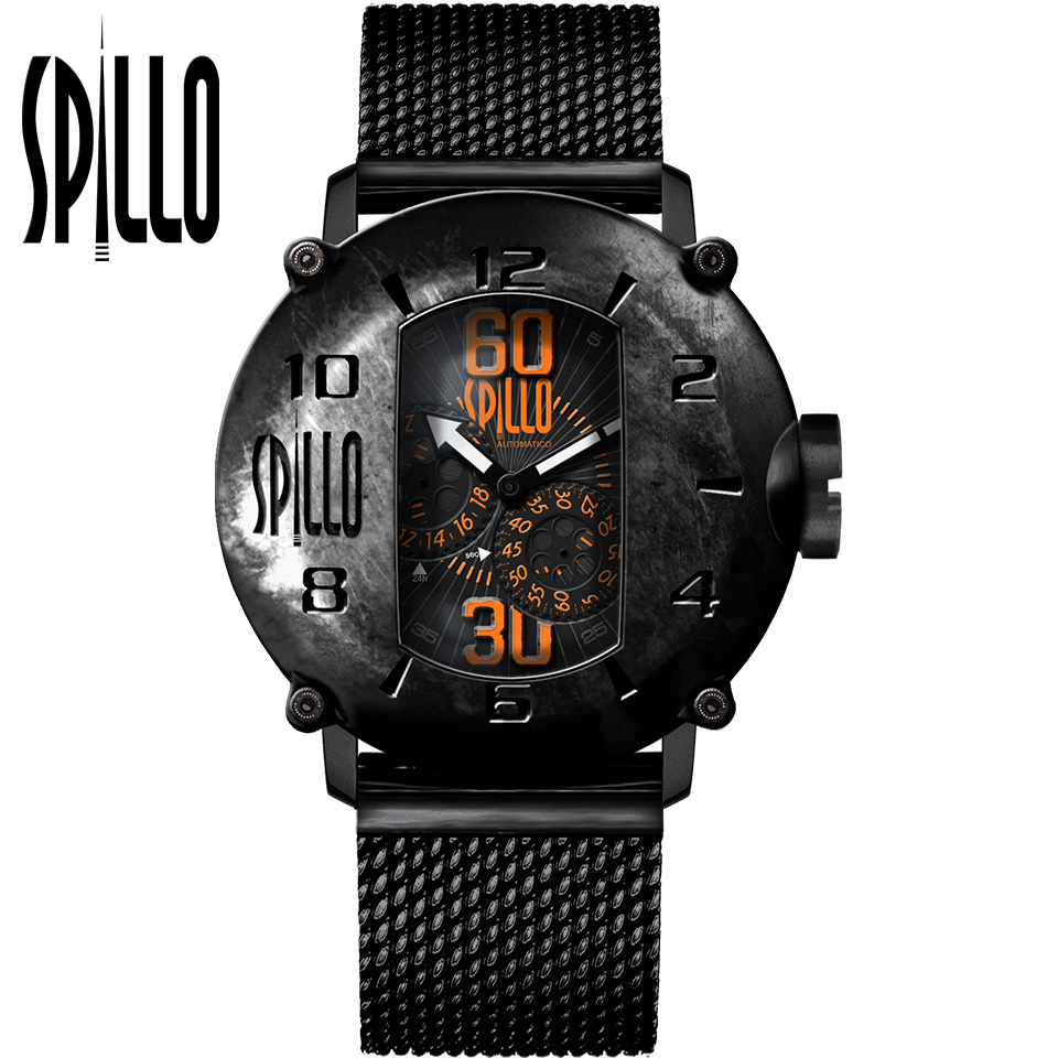 Ref. SD917KK-18BLACK ケースの形状 ラウンドフェイス ケース素材 316L ステンレススティール / MATT BLACK塗装 ケースサイズ 直径45 mm / 厚さ14 ㎜ ケースカラー STEEL 風防素材 サファイアクリスタル シースルーバック 表示タイプ アナログ表示(スモールセコンド 24時間計) ムーブメント Miyota 82S7 (自動巻き 日本製) / パワーリザーブ40時間 / 21600振動/時 文字盤カラー BLACK/WHITE(夜光インデックス) バンド素材・タイプ ワニ革(アリゲーター ヴィンテージ加工) バンド留金タイプ バックル バンドカラー BLACK 防水性能 5気圧防水 重量 128 g メーカー保証 2年間SPILLO SPEED DEMON SD917KK-MK