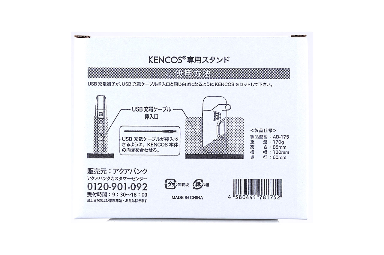 製品名称: KENCOS4 (ケンコスフォー) 電源 : 充電式リチウムイオン電池 電池規格: 3.7V(1000mAh) 充電電力: 5V / 1A(USB) 充電端子: micro USB 充電時間: 約2時間 電力量 : フレーバー発生:最大10W 水素生成: 最大25W 水素発生方式: 電気分解式 水素発生量: 最大8ml/分 フレーバー発生方式: カートリッジ交換式 外装素材: ポリカーボネート 使用温度範囲: 5℃~35℃ 外形寸法: 幅:55mm×高さ:132mm×厚さ:24mm (ヒンジ部含む幅:65mm) 重量: 128g ※電解液、カートリッジは除く。 ※本製品の仕様は予告なく仕様を変更することがあります。 KENCOS4 搭載機能 ● 3つの使用モード ・水素モード ・水素+フレーバー併用モード ・フレーバーモード ● 2通りの水素発生方法 ・ボタンを押す間のみ水素が発生する通常発生 ・ボタンを押し続けなくても水素が発生する連続発生 ● 2つの安全機能 ・過熱防止安全機能 ・傾きセンサー A管001911005KENCOS4 3点セット ホワイト (本体+電解液+タバコフレーバー)