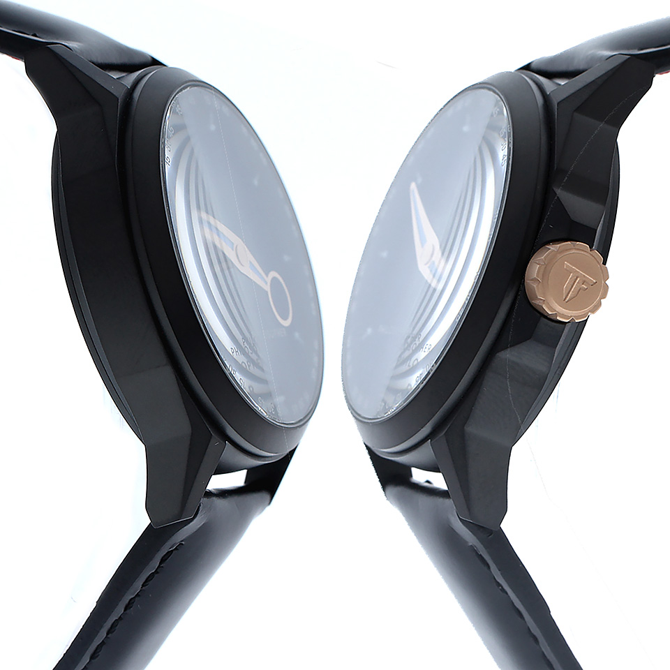 316Lステンレススティール製のケースは、直線的な面で構成されたエッジの効いた精悍なデザインで、ベゼル外周の緩やかなオクタゴンの面取りの造形は「フィロソファー」にさりげなく知的な表情を与えています。ケースサイズは、幅40mm、厚さ12.5mmで、大き過ぎず小さ過ぎないちょうど良いサイズ感です。ケースのカラーは、梨地仕上げのシルバーと、DLCコートが施されたブラックの2色で、どちらも光沢を抑えた高級感のある質感となっています。