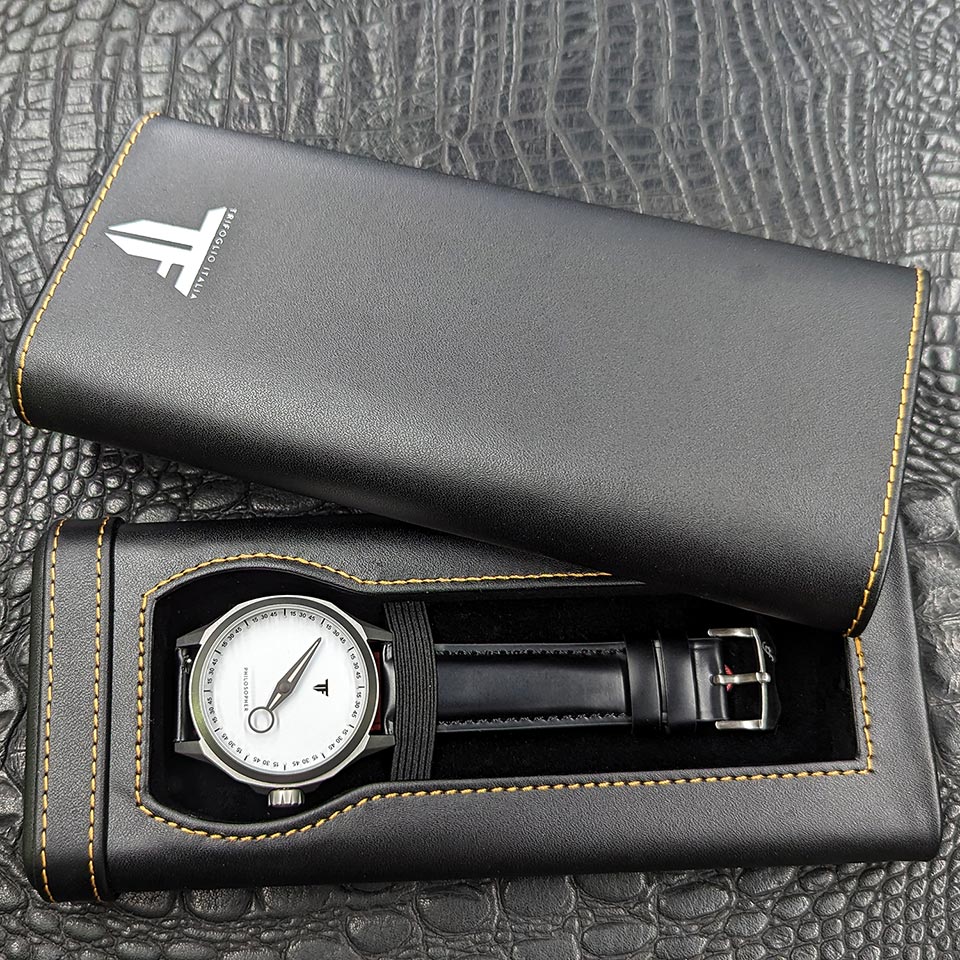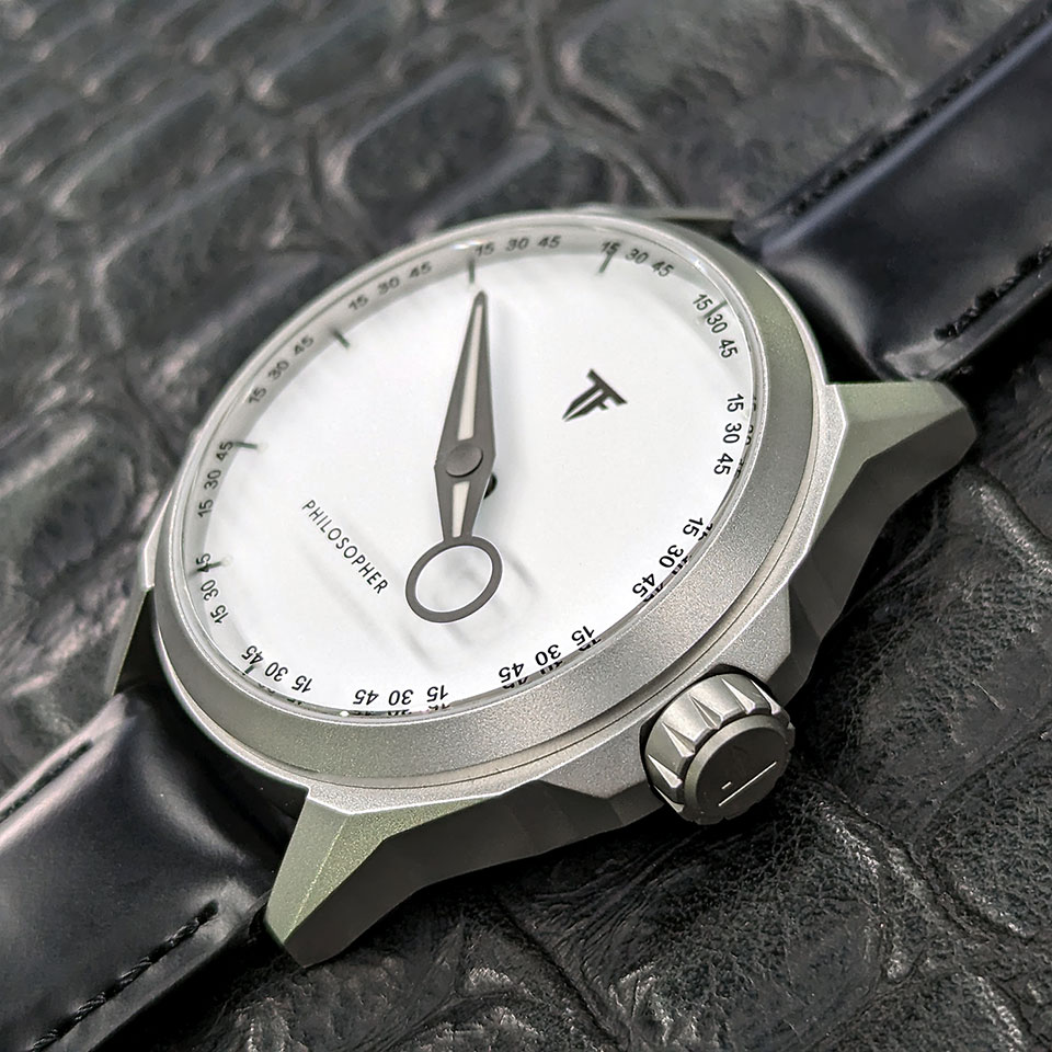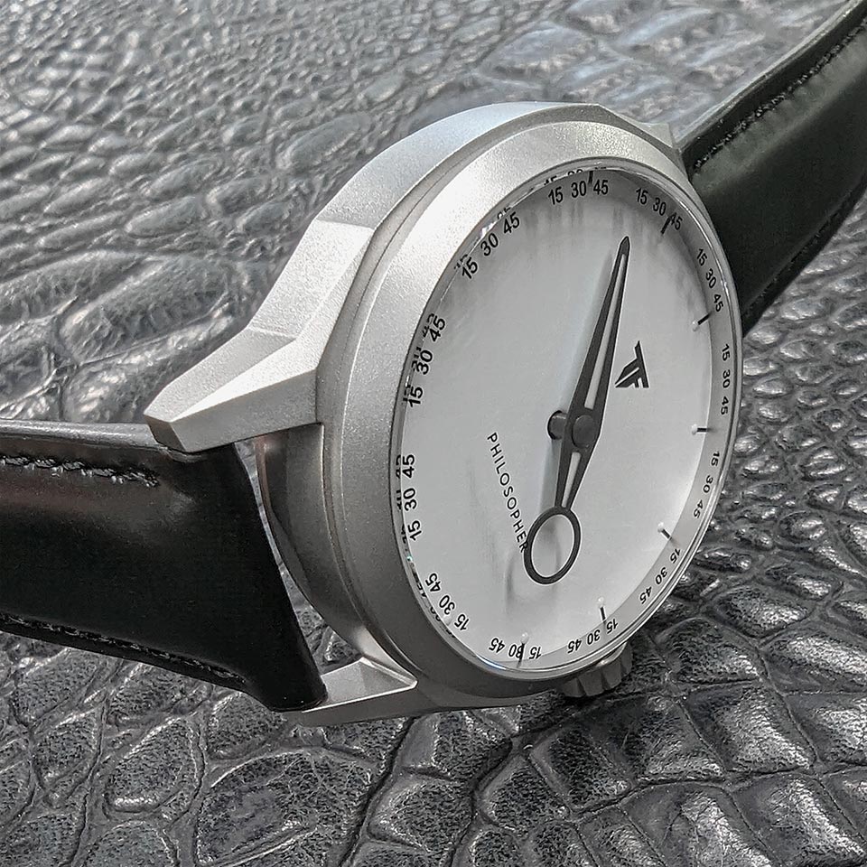 「フィロソファー」は、時間という概念を改めて考えさせ、見る者に知的遊戯を提案します。これは、ひたすら効率化が求められる現代社会において、ハイブランドからスモールブランドまで、多機能なクロノグラフウォッチが主流となっている腕時計市場に、あえて異彩を放つものです。こうしたモデルを大胆に打ち出すことが、トリフォグリオの持つ感性であり、哲学=フィロソフィーといえるでしょう。