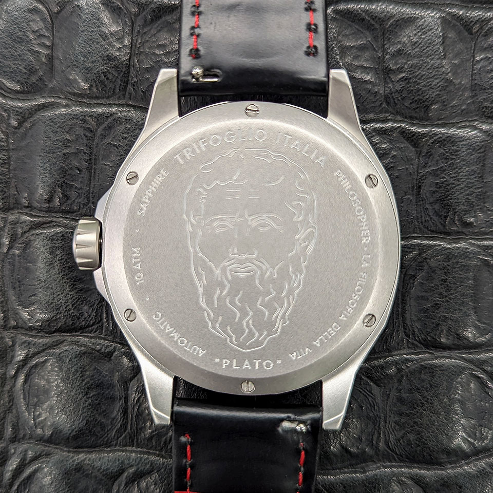 裏蓋には、古代ギリシャを代表するフィロソファーであるプラトンの肖像がレーザー刻印されています。