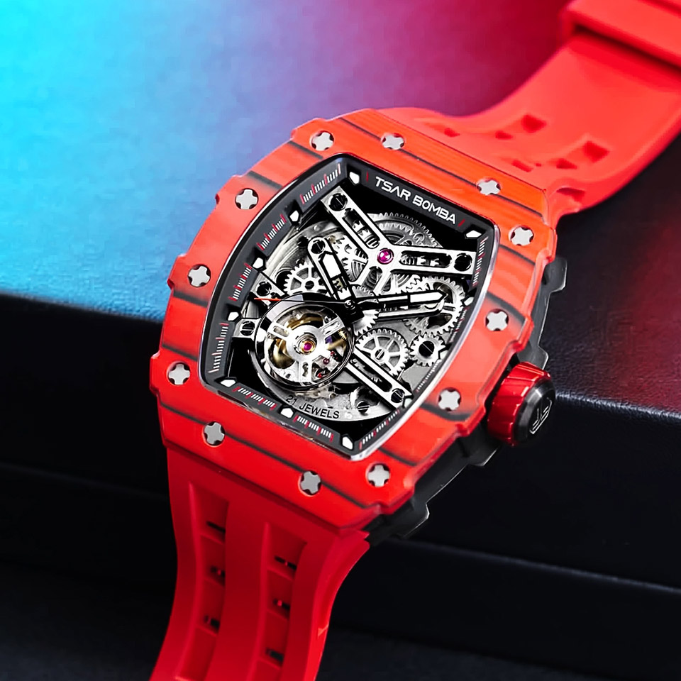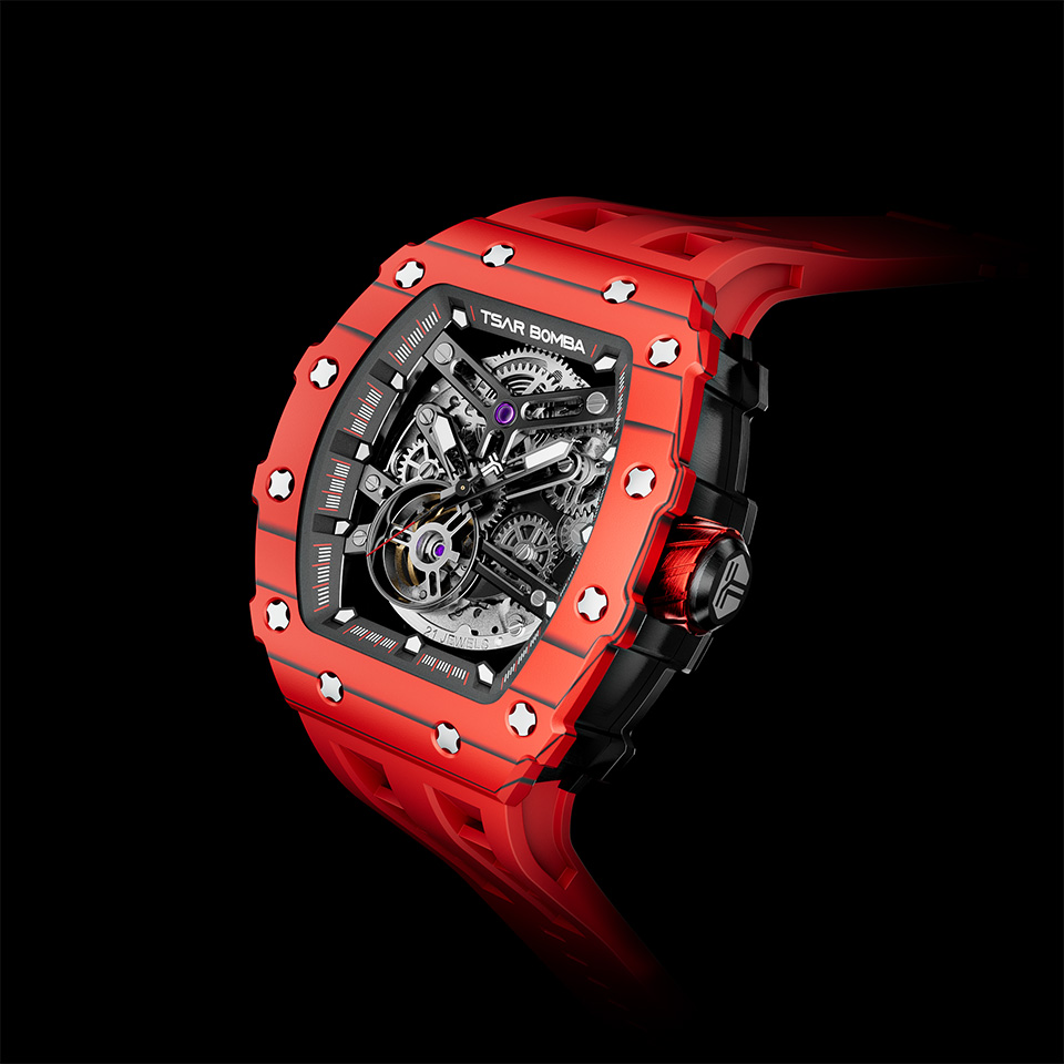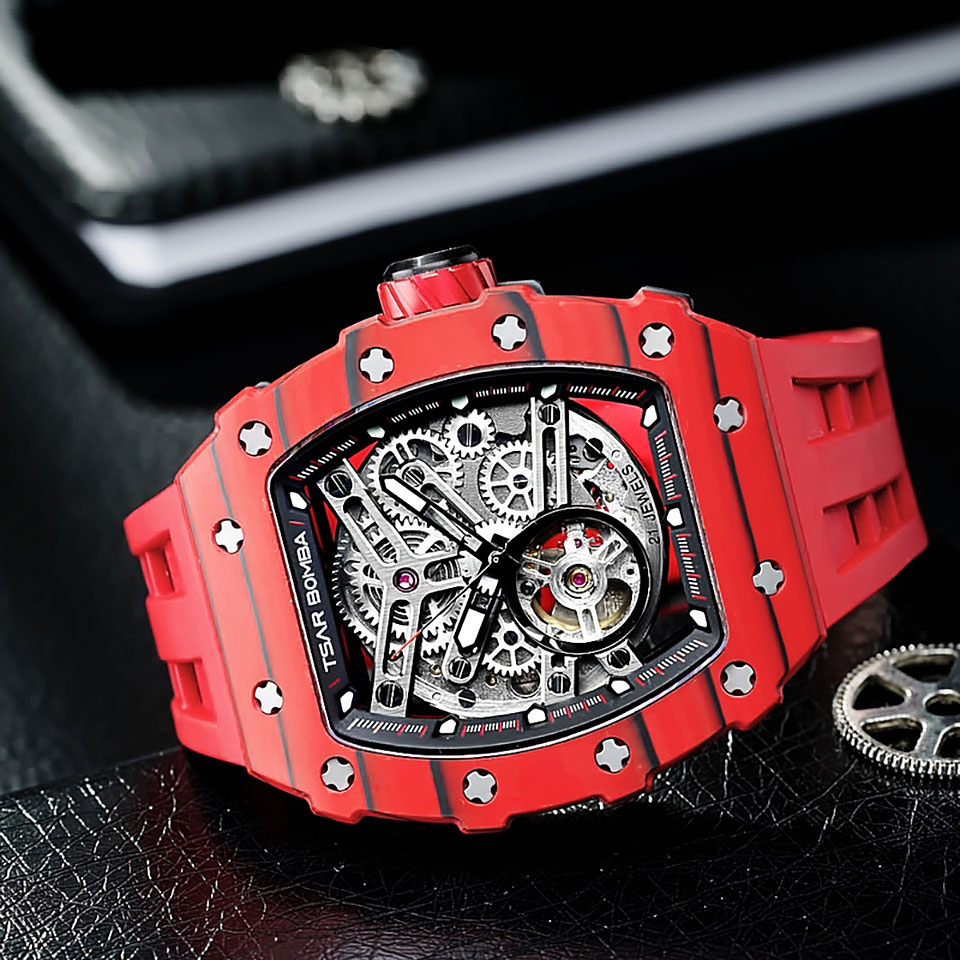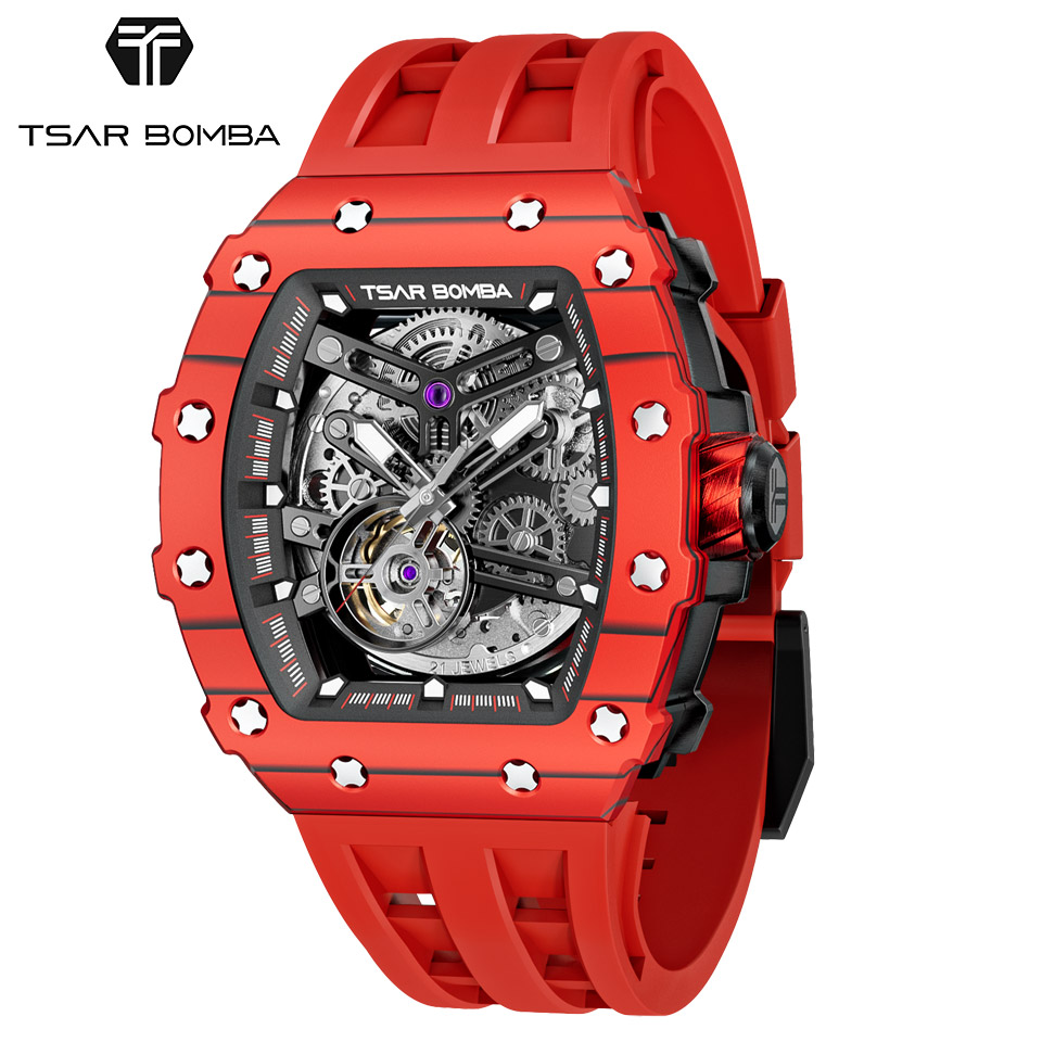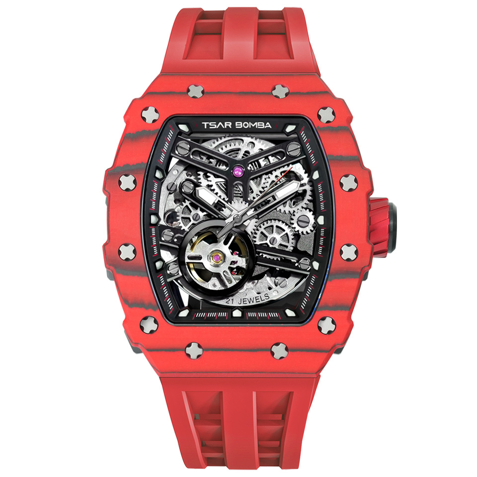 TSARBOMBA TB8208CF-07 カーボン レッド サーボンバ スケルトン腕時計